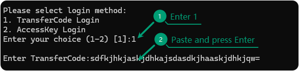 Open the TransferCode hyperlink in the email, click to copy the TransferCode, enter 1 in the software to select the TransferCode login method, paste and press Enter.