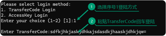 单击上方复制TransferCode按钮,在软件中输入1选择TransferCode登录方式,粘贴并回车